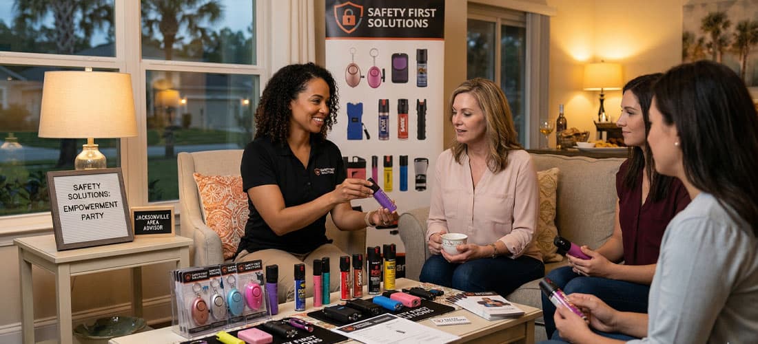 A: Think of it like a Tupperware party, but with products people genuinely need. You lay out your display — pepper sprays, stun guns, personal alarms, diversion safes — and spend 30 to 60 minutes walking guests through what each product does and why they’d want it. People handle the products, ask questions, and place orders. The host gets a thank-you gift or a percentage of sales, which makes it easy to find willing hosts once you’ve done your first one.