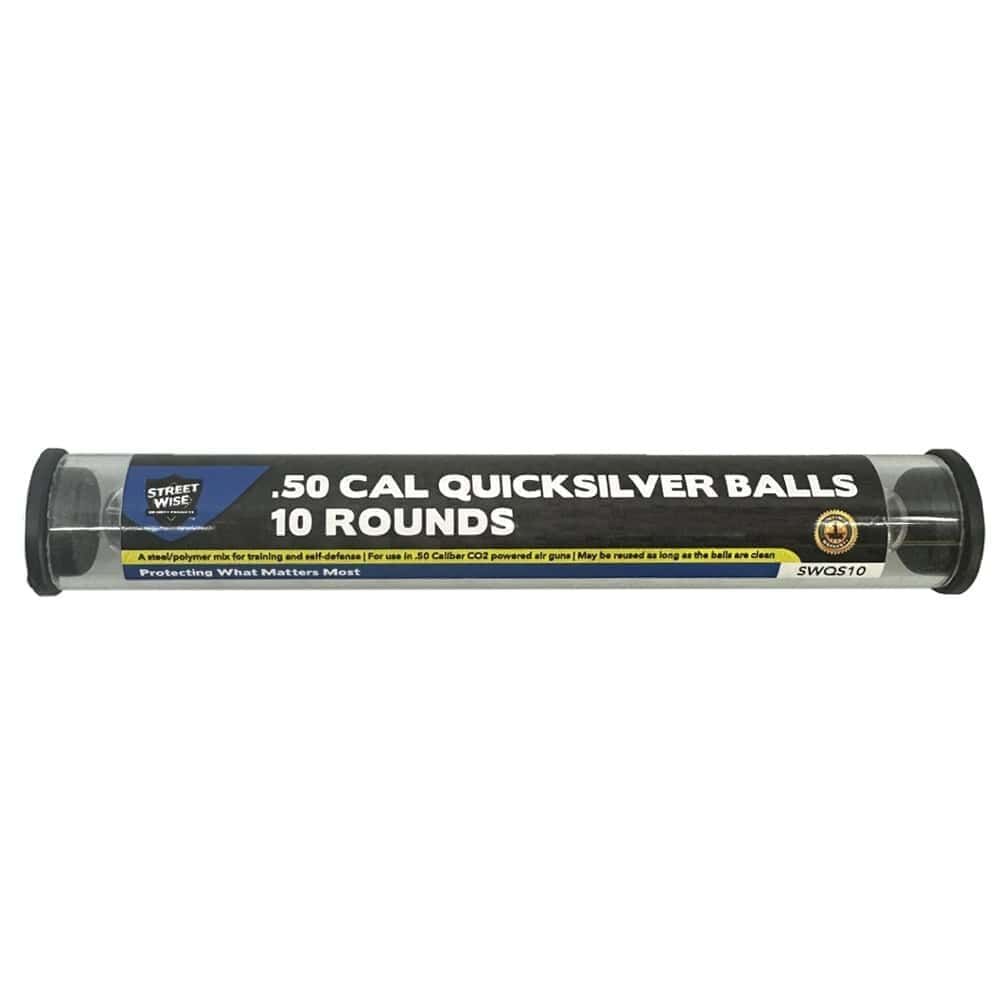 Each tube contains 10 rounds of .50 caliber Quicksilver projectiles. Dimensions per tube: 0.6″ x 0.6″ x 5.3″. Construction: 12mm stainless steel core with clear ABS outer casing. No chemical payload. Weight: 0.1 lbs per tube. 1-year warranty. Compatible exclusively with Streetwise Heat Pepper Launchers. Store in cool, dry conditions.